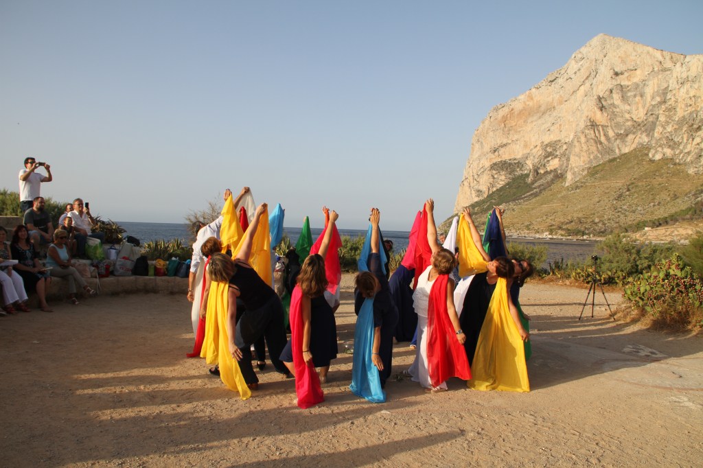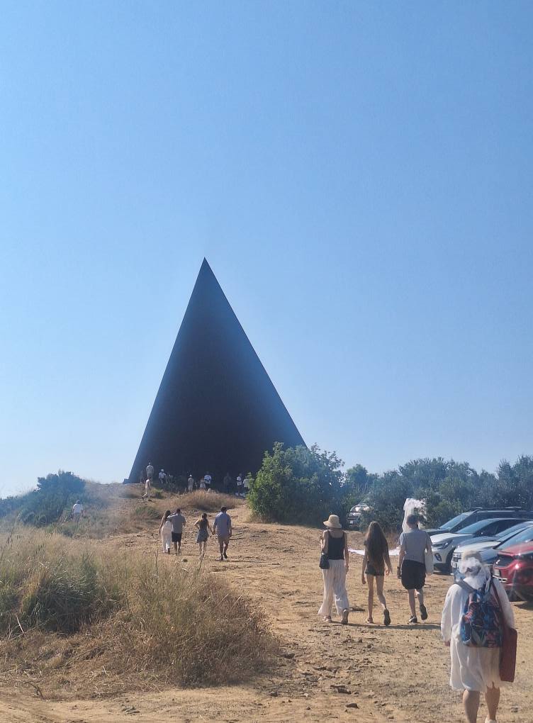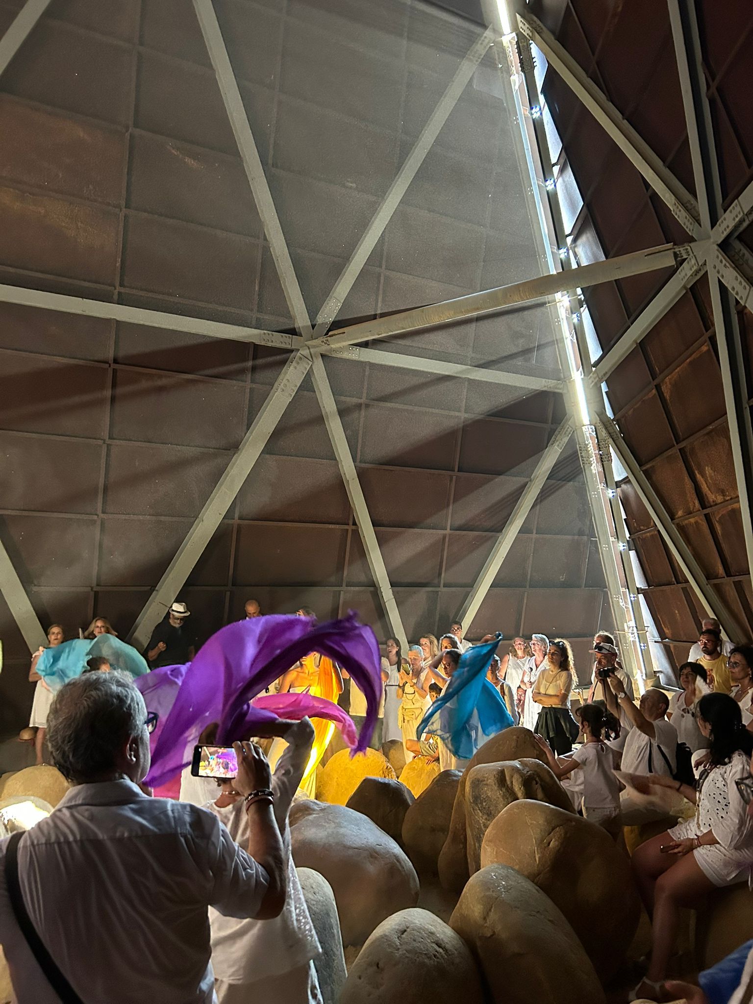 La piramide creata da Staccioli fa parte del circuito Fiumara D’Arte, ed è nota anche come “Piramide della luce” perché, durante il solstizio d’estate, i raggi del sole che penetrano attraverso una fessura creata nell’opera, inondano l’interno di luce, simboleggiando il passaggio dal buio alla luce. Eravamo lì dentro alle 18 ora in cui questo fascio di luce luminosa era fortissimo. C’era molto caldo .. al raduno di tamburi condotto da Lucina Lanzara e sulle note del violino di Bjm Mario Bajard, siamo entrate tra i massi e abbiamo cominciato a danzare con i veli colorati mentre la compagnia di Paola Cassara’ entrava per esibirsi. Una sinergia di artisti spontanea e fluida che ha elevato l’energia verso l’alto in una vibrazione che risuonava con la Piramide. Così come danzare sull’incanto dell’invisibile percorrendo la spirale tracciata dai massi deposti a terra ha dato ancora più senso a quel momento magico.