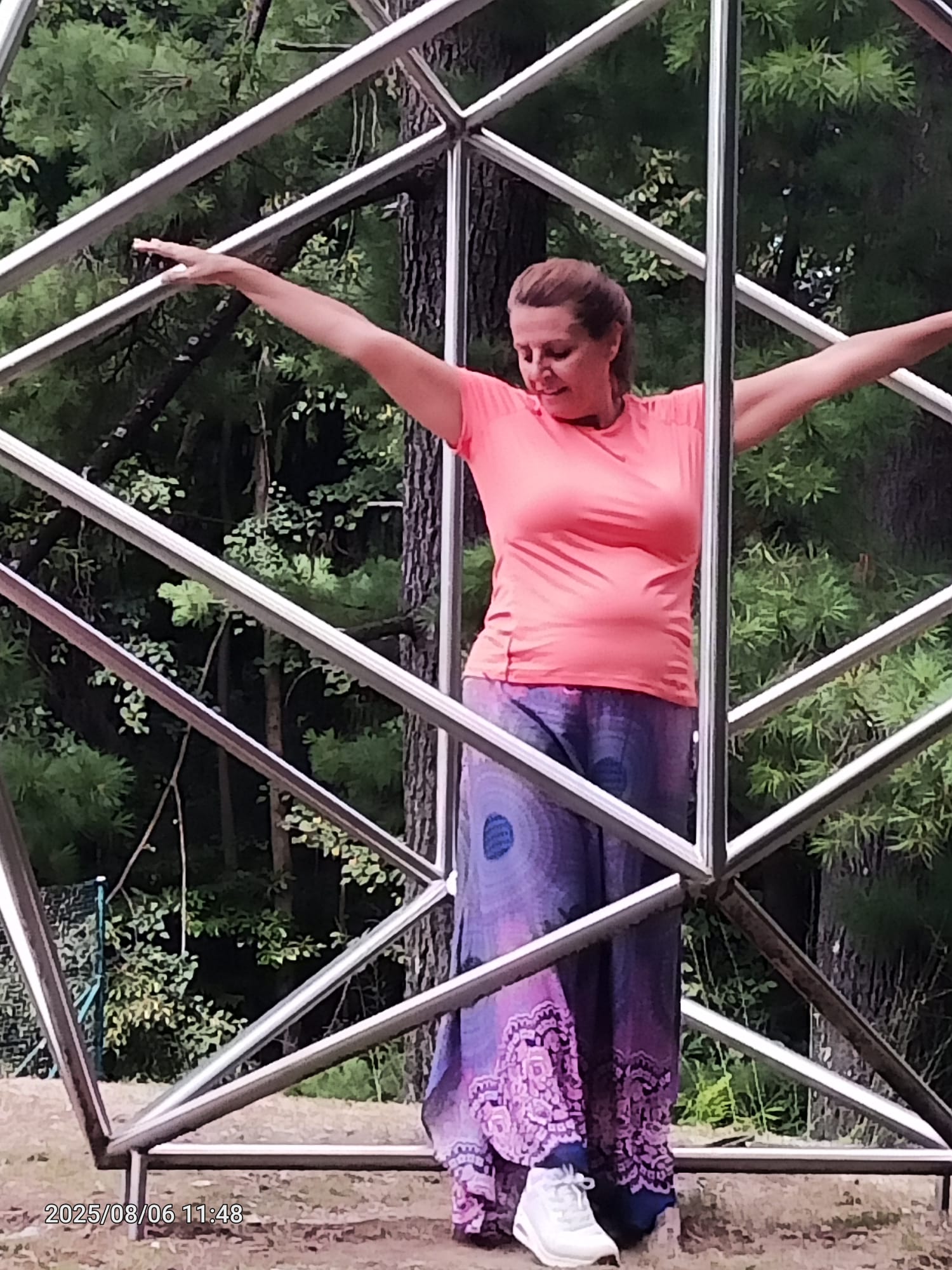 La danza nella Natura, in cerchio, con la ricerca di una spiritualità che nasca dal senso di comunità, mi ricorda molto il cuore della Danza del Diamante. Il culmine di questa fusione con la Natura l’ho vissuto quando, mentre danzavo dentro l’Icosaedro, una farfalla si è appoggiata sul mio fianco e poi dietro, rimanendo attaccata nonostante i miei movimenti, per poi fare un giro intorno al mio corpo e volare via. E’ stato commuovente! Danzare e percepirmi dentro l’Icosaedro mi ricaricava. Alla fine stavo immobile e mi sentivo inondata da un bagno di Luce. Stupendo!