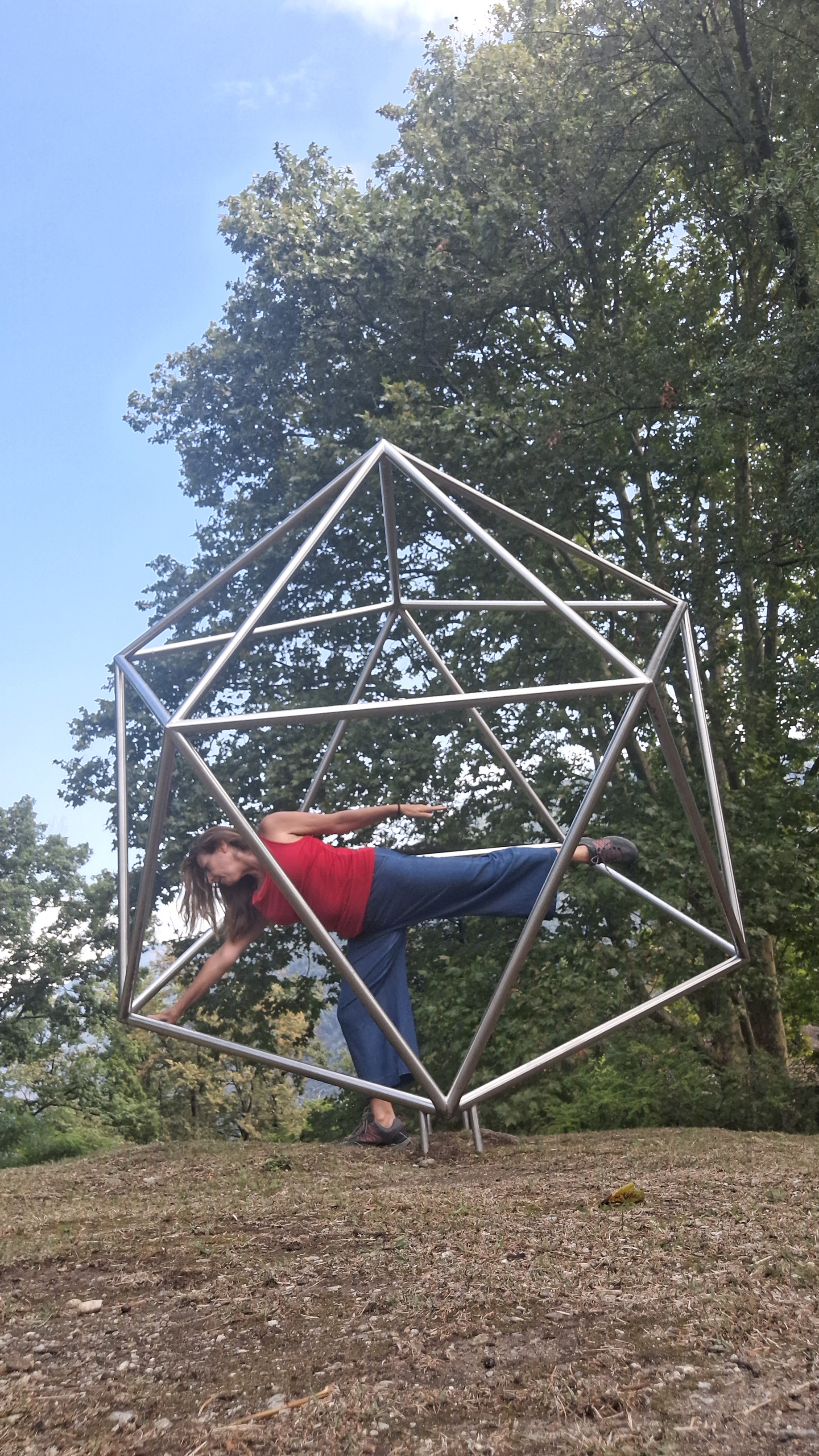 Mi sono immersa nei suoi sentieri, nei suoi musei, in particolare casa Anatta che raccoglie materiale e documenti che attestano il fermento dei pensatori e artisti che lo hanno abitato, le loro UTOPIE, il desiderio di voler vivere in maniera alternativa al mondo capitalistico e materiale. Ognuno ha dato il suo contributo. In particolare mi ha attratta il lavoro di Von Laban e la sua area Training in cui oggi è posto un Icosaedro. Ogni mattina entravo al suo interno come fosse un Diamante sacro. Lasciavo il mio corpo muoversi, spinto dall’intenzione di andare verso i vertici dello stesso e seguire le direzioni delle sue linee; la forma che il corpo assumeva era solo una conseguenza di questa intenzione, non il fine. Li’ dentro poi, lasciandomi andare, in maniera più fluida, il corpo sembrava mosso da polarità opposte che lo attraevano da un lato e dall’altro, facendolo a volte oscillare. Infine, ho provato a ripercorrere certi concetti chiave dello studio del movimento di Laban. Egli, contribuendo allo sviluppo della danza espressionista, ha analizzato il movimento secondo parametri quali il peso, lo spazio, il tempo gli efforts. Ha parlato di piani, livelli, direzioni, cinesfera; ha creato anche il primo metodo di scrittura della danza detto “Laban notation”. Ha formato importanti danzatrici come Mary Wigman, Suzanne Perrottet e Katia Wulff. A monte Verità andò in visita anche Isadora Duncan! Lì veniva praticata anche l’Euritmia di Rudolf Stainer. Un particolare rilievo è dato, a casa Anatta, anche alla storia della danzatrice Charlotte Bara a cui fu dedicato un Teatro.