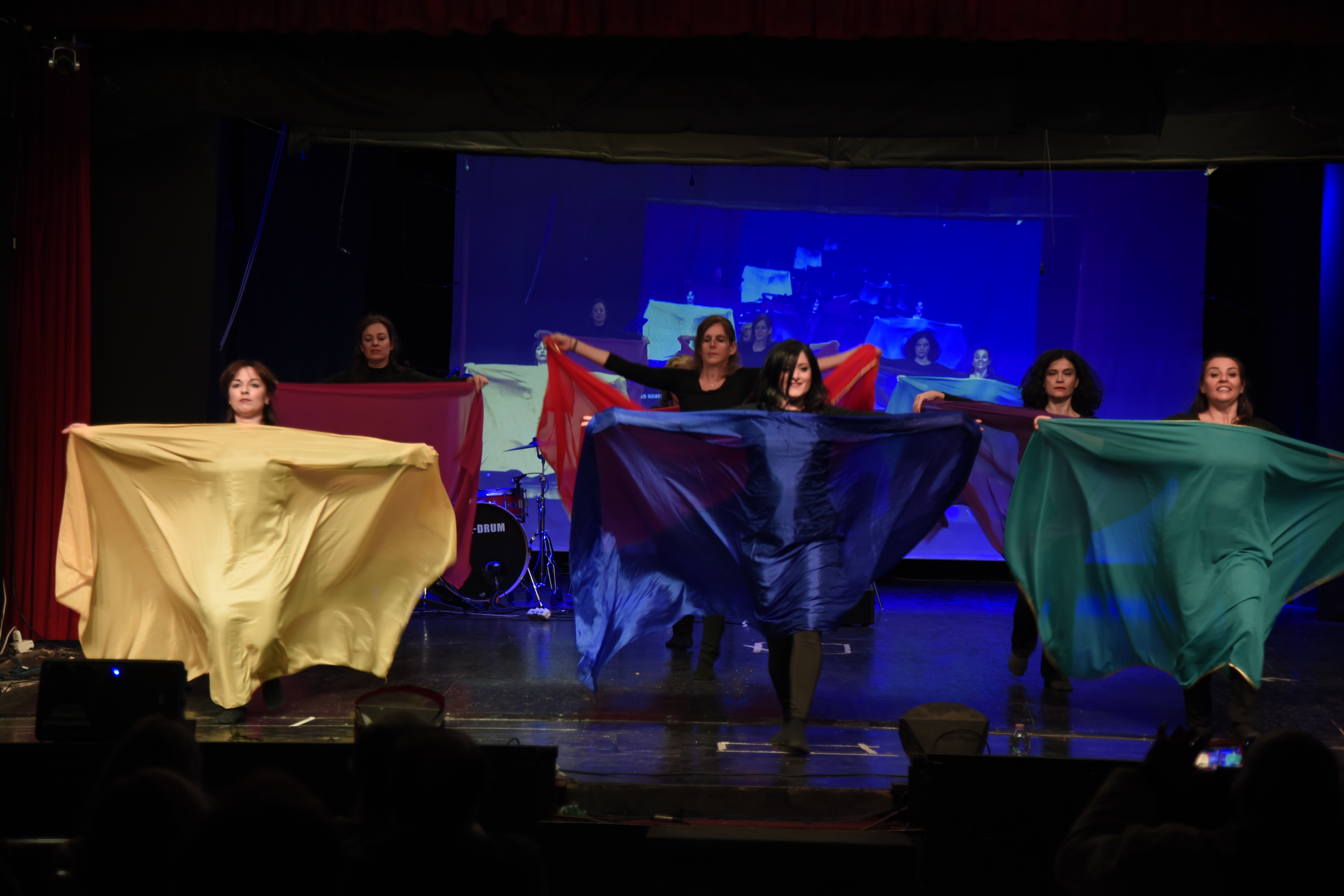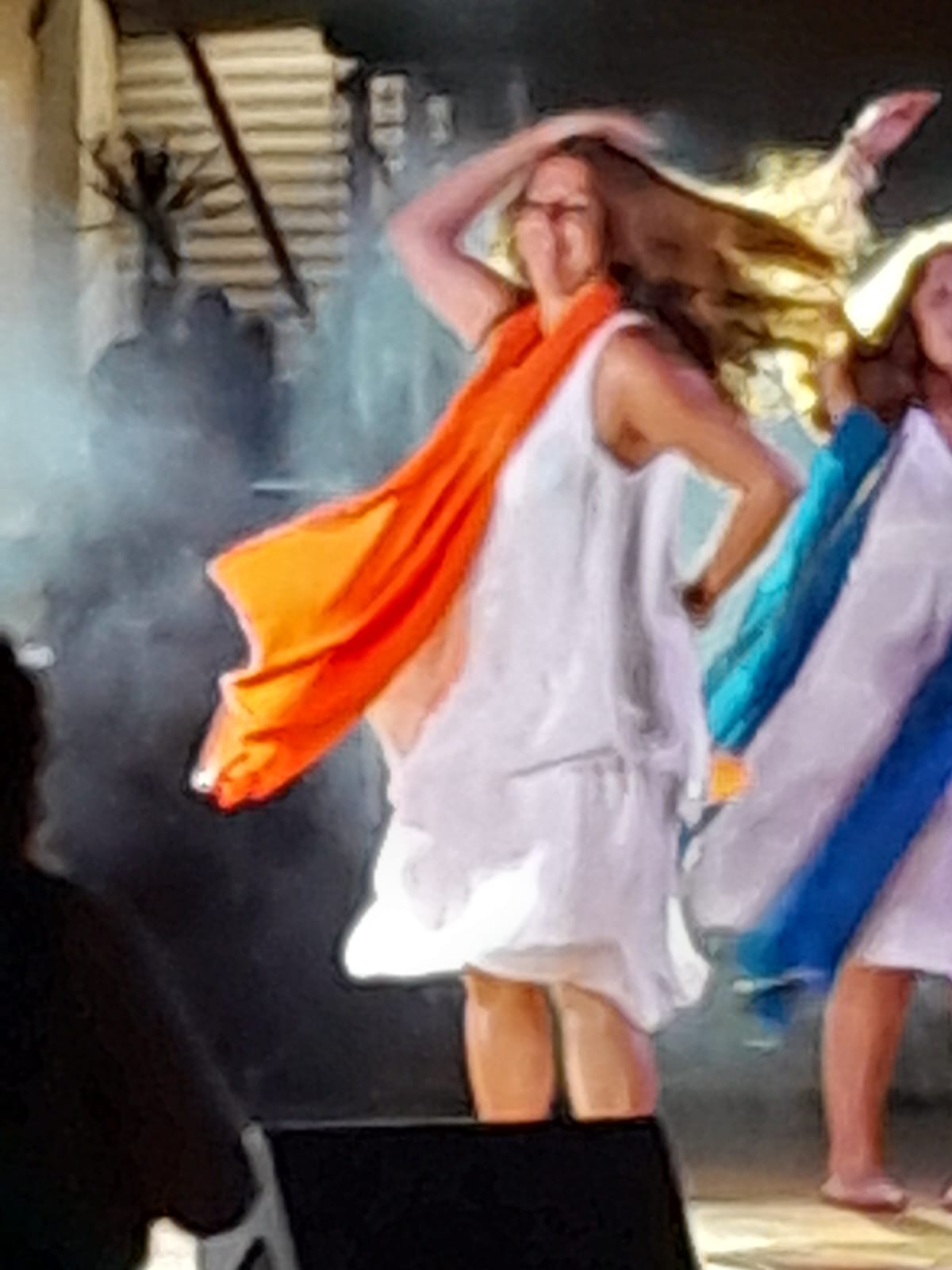 Abbiamo aperto lo spettacolo con la danza sulla poesia “La Pace”, scritta da Alessandra Di Girolamo ed interpretata dall’attore Marco Feo, su musica composta e suonata in scena da Fabio Poeta mentre la pittrice Cristina Patti dipingeva sul palco un bellissimo quadro con il simbolo dell’infinito. I nostri movimenti con i veli e le mani colorate hanno trasformato in danza le parole della poesia alimentando un’esperienza unica per la sinergia di diverse arti in azione contemporaneamente. Più che mai attuale ed emozionante è stato danzare “Heal the world” in un momento in cui la guerra sta interessando paesi sempre più vicini al nostro. Anche in questo caso la semplicità della danza ripetuta con i veli e l’armonia che ne è scaturita ha coinvolto molto il pubblico tanto da trascinare delle bambine nell’imitazione dei movimenti. E’ stato fantastico guardarle mentre danzavamo.. una vera e propria trasmissione di energia circolare e rigenerante: da noi a loro e da loro a noi.