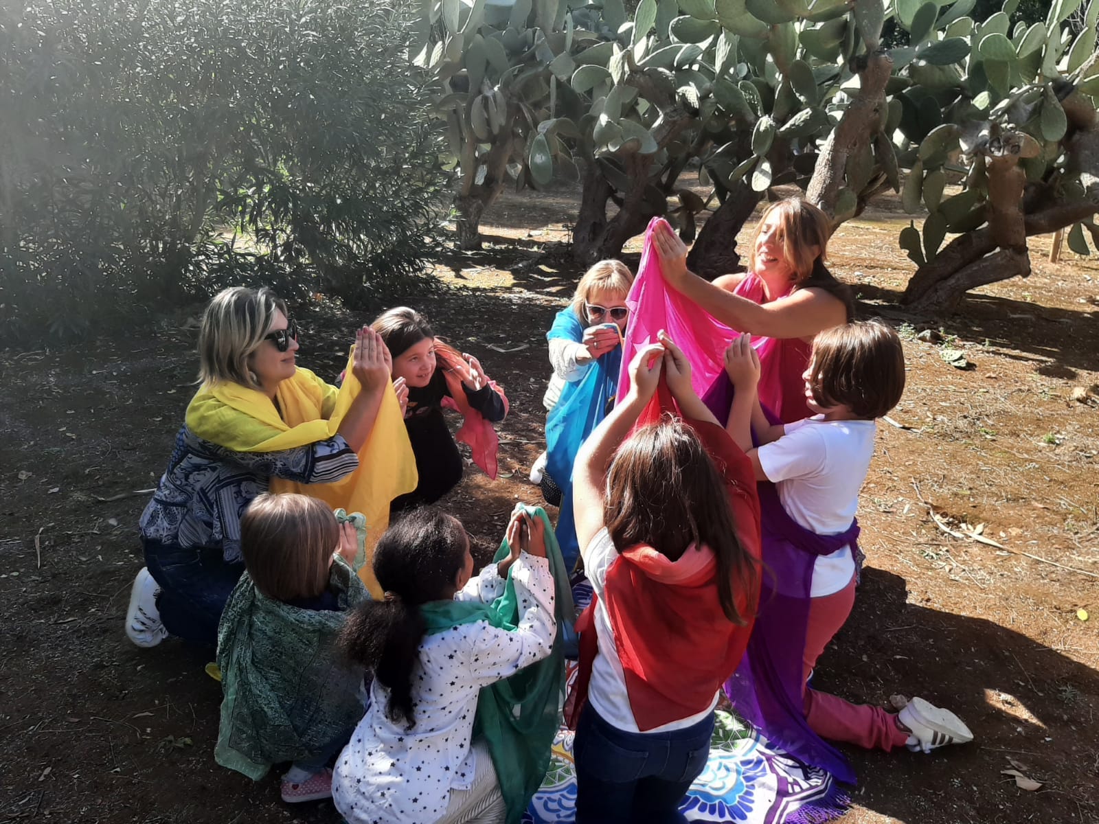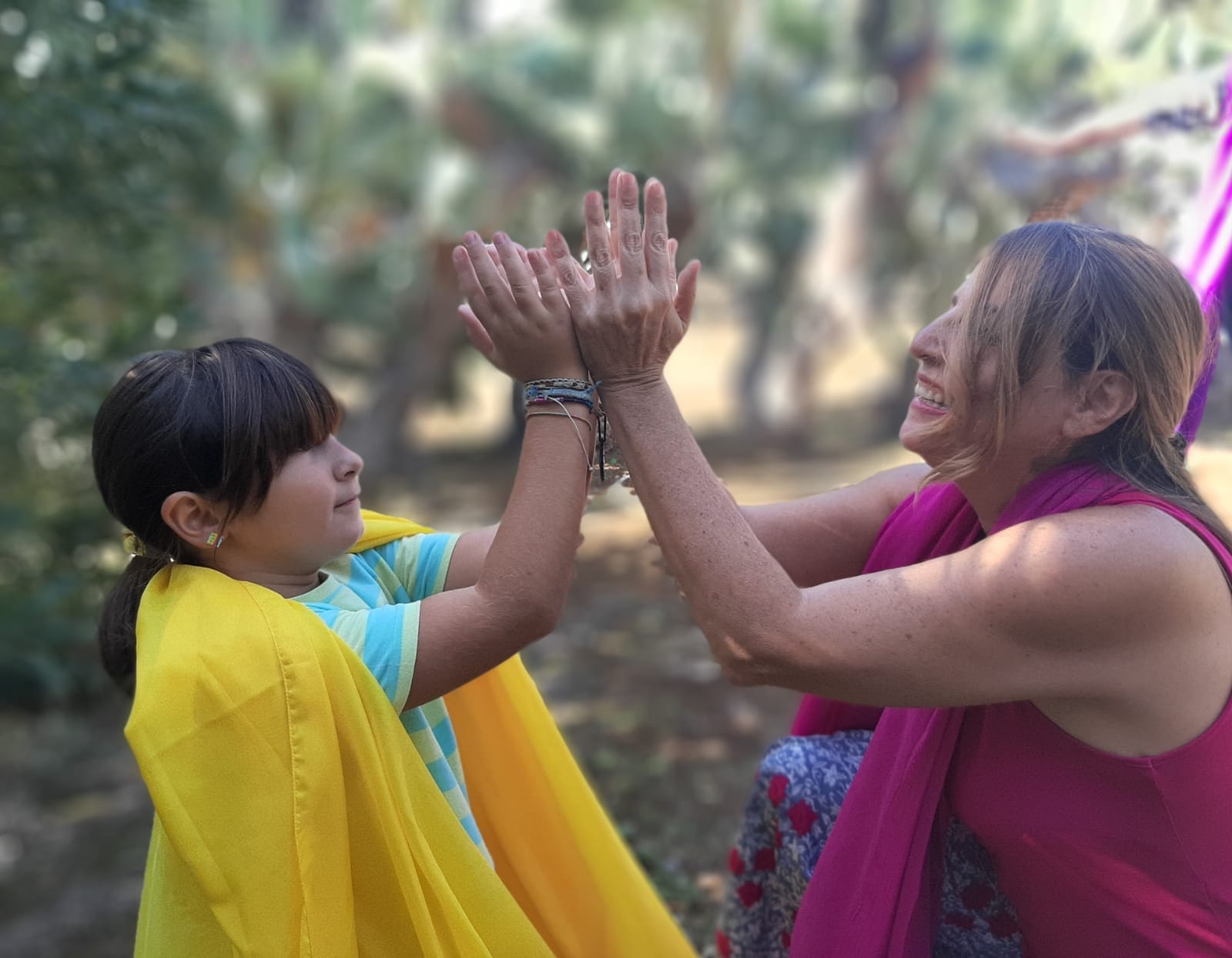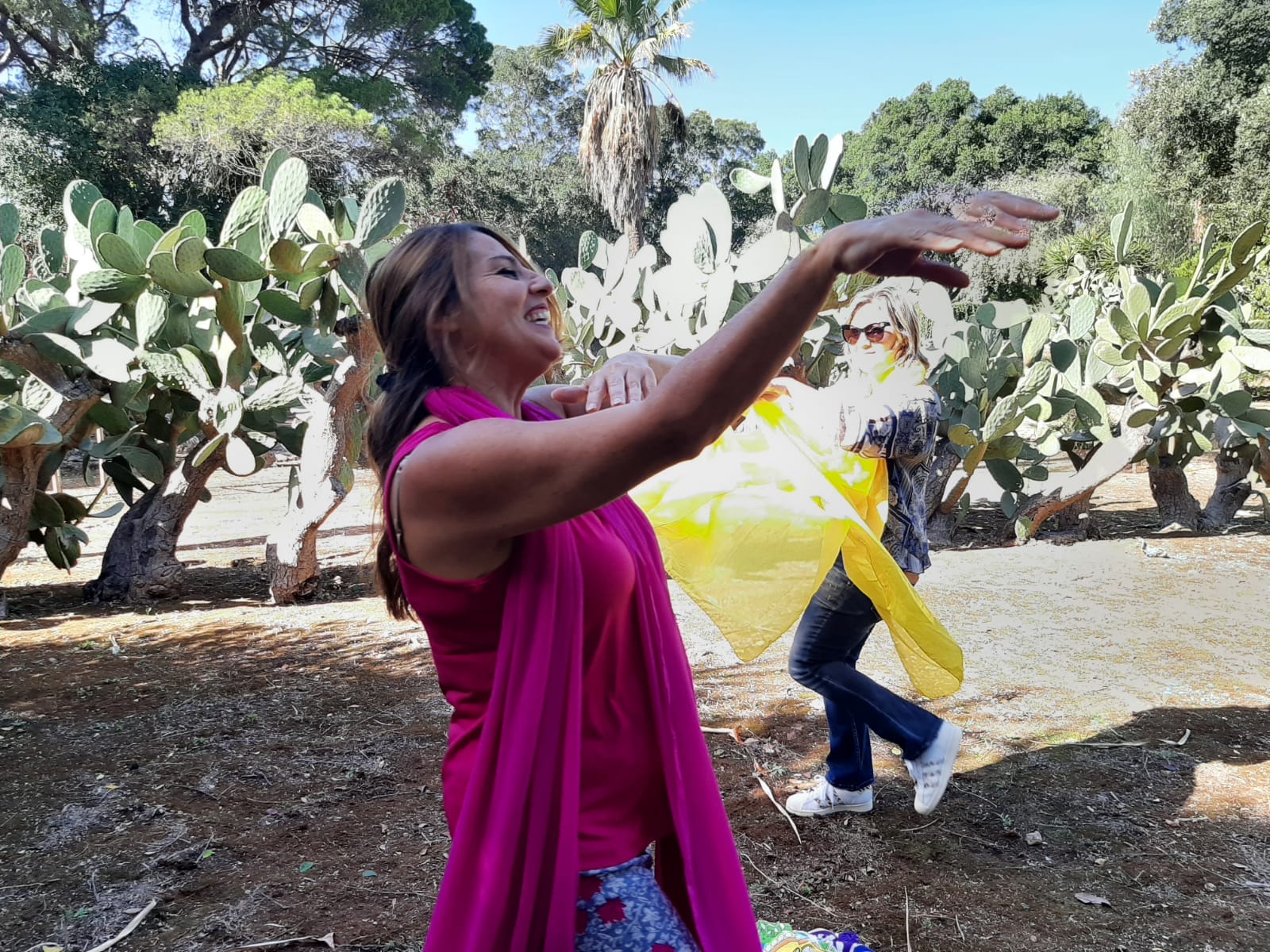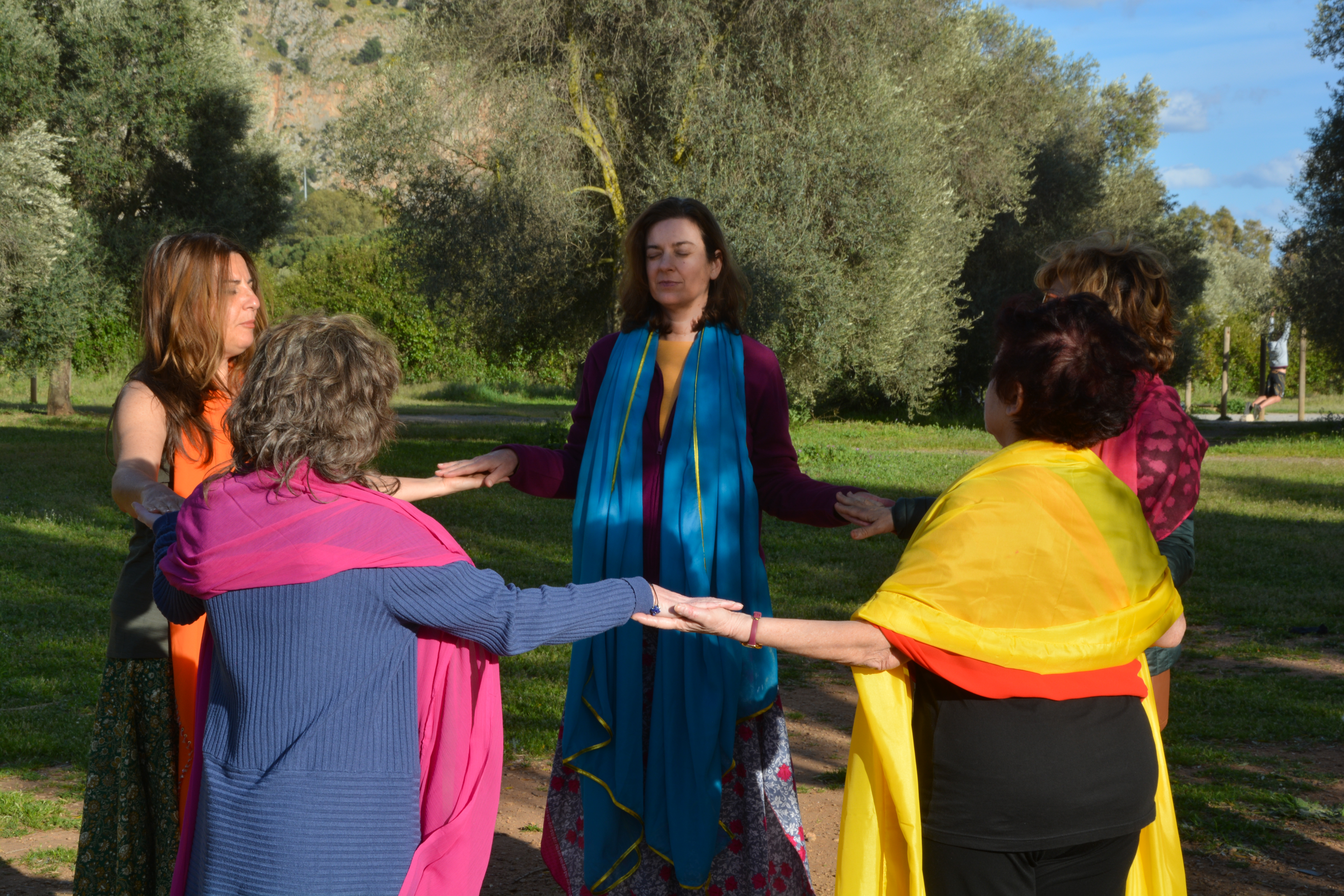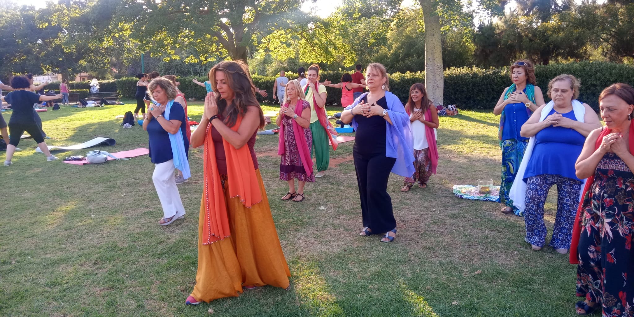 Dopo l’intensa attività di Yoga condotta da Chiara con il “Saluto al Sole” ripetuto e intercalato da letture che coronavano il senso dell’incontro, sulle note della musica “Figlia del cielo” di Roberto Cacciapaglia, abbiamo danzato e vissuto nel corpo il Sole; abbiamo interpretato il tramonto e il suo sorgere lento con l’Alba, la Luce e il Calore che con i suoi raggi avvolgono la terra, il Sole che è dentro di noi e dal nostro cuore viene emesso all’esterno per raggiungere gli altri, connettendosi con il Tutto. Ogni movimento agiva nell’interiorità. Nonostante l’avessi spiegata sul momento si è creata armonia nel gruppo danzante e qualcosa ha toccato le corde più profonde di qualcuno.. visibile attraverso le lacrime che inondavano gli occhi. Sono grata a Chiara per l’occasione che mi ha offerto. Yoga e Danza del Diamante.. una profonda sinergia e il medesimo fine: celebrazione dell’infinito e dell’Assoluto!