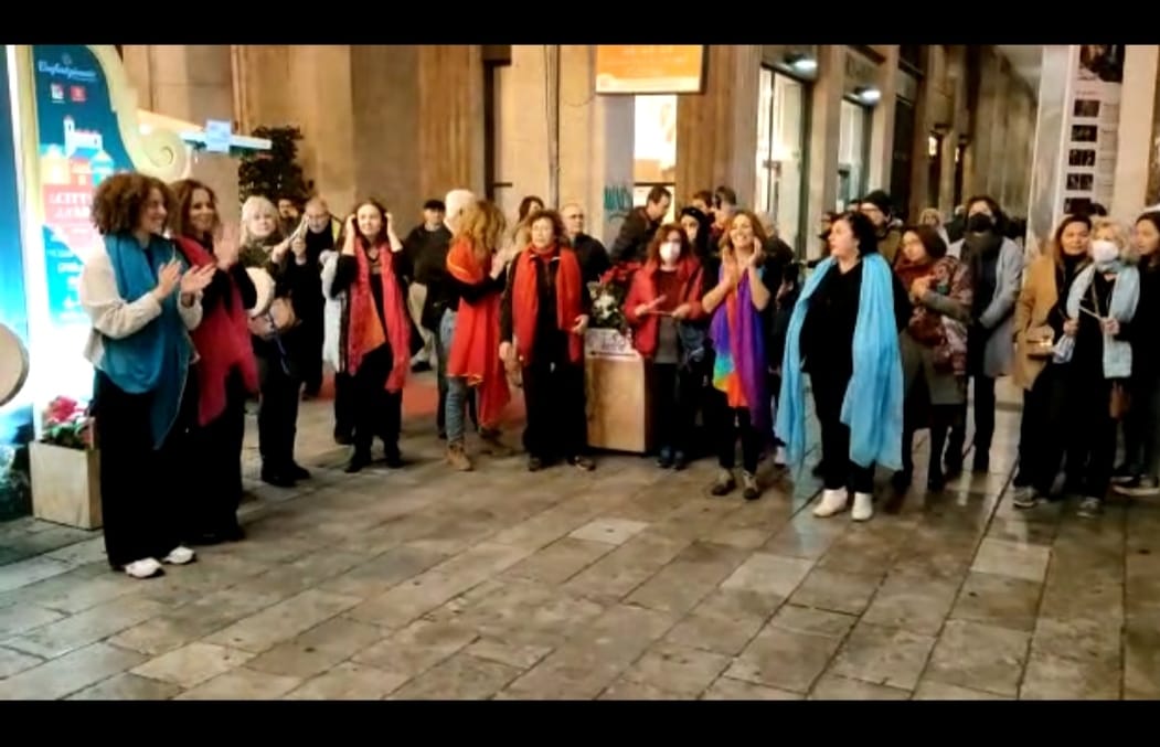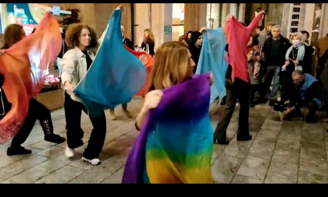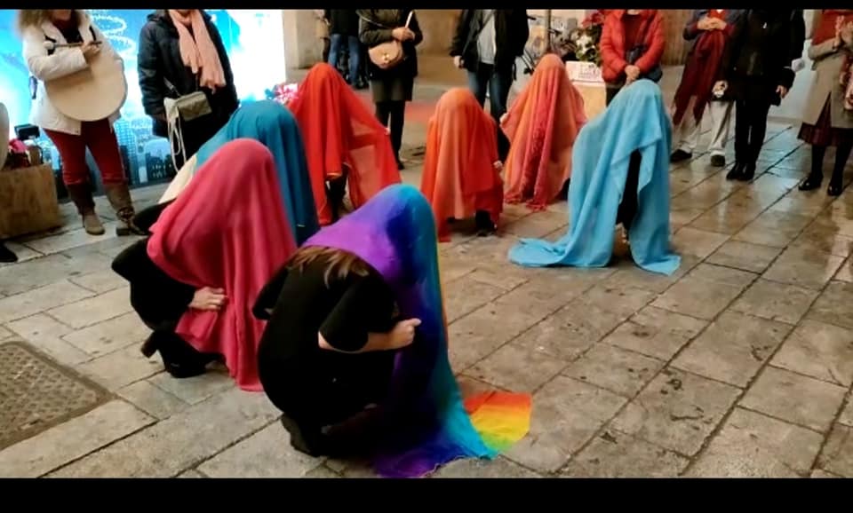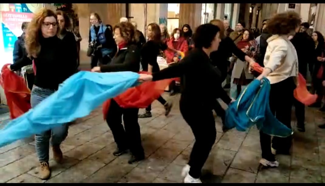 All’inizio di questo nuovo anno, ci siamo unite, per raccogliere la volontà del giovane iraniano Majidreza Rahnavard, che prima di essere giustiziato a soli 23 anni, ha chiesto sulla sua tomba non venissero recitati versetti del Corano o preghiere ma canti di gioia (“festeggiate e suonate musica allegra”) . Abbiamo voluto dare eco alla protesta Donne Vita e libertà che tocca il mondo intero partecipando al cerchio di suoni con l’artista Lucina Lanzara che ha animato la protesta con suoni di tamburi, canti e slogan arricchiti dalla danza dei nostri veli colorati.